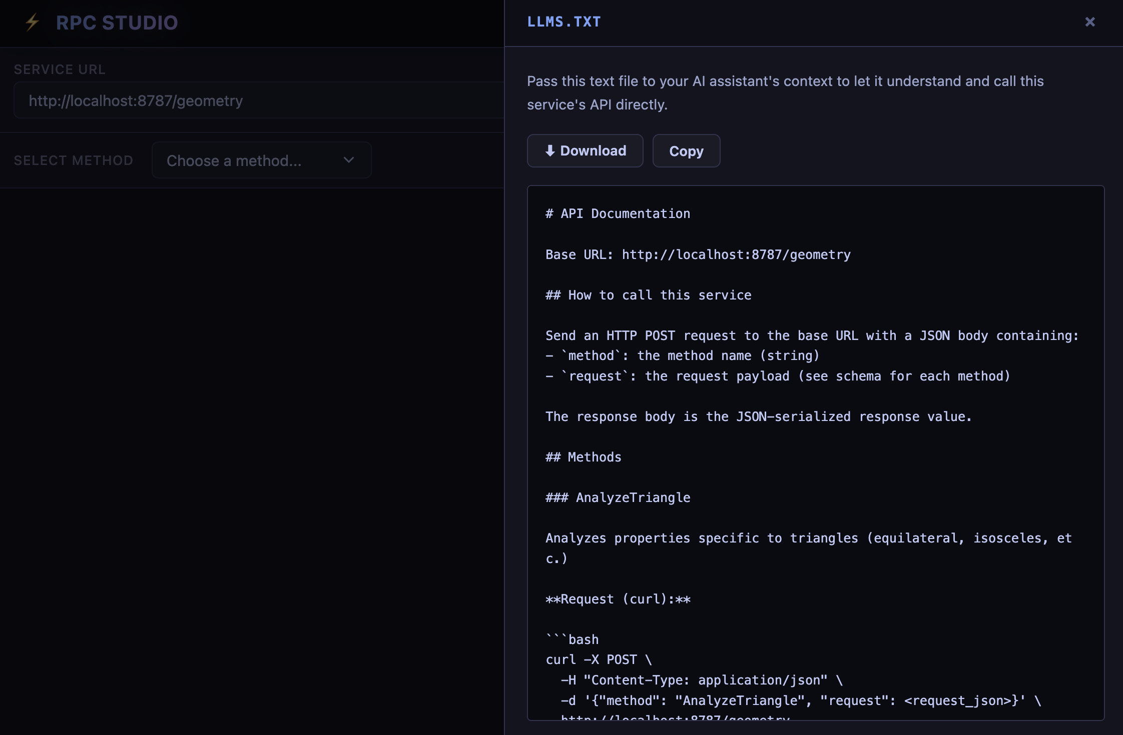 RPC Studio also lets you download a lightweight instruction file that you can pass to an AI agent. It teaches the agent how to call your API, what each method does, and the input/output schema for each method.